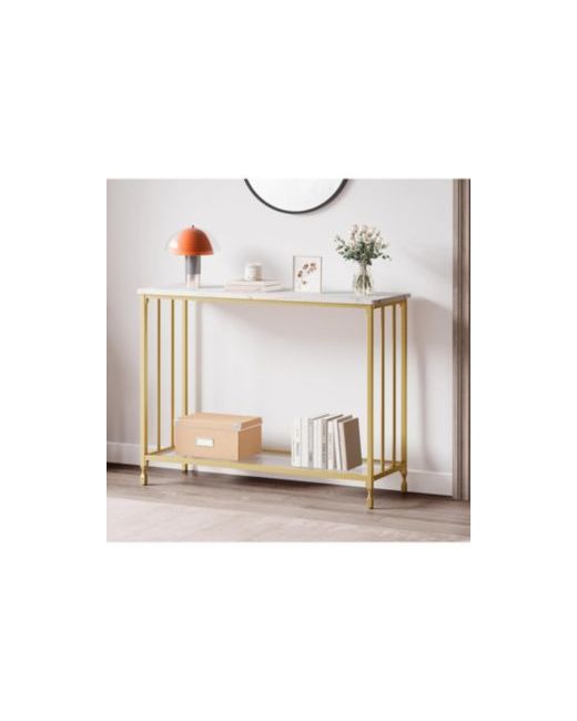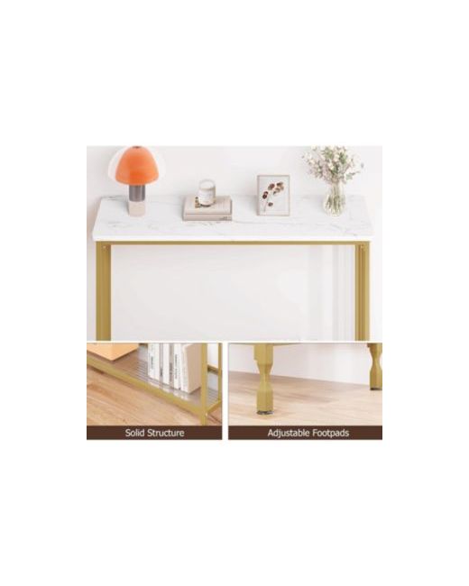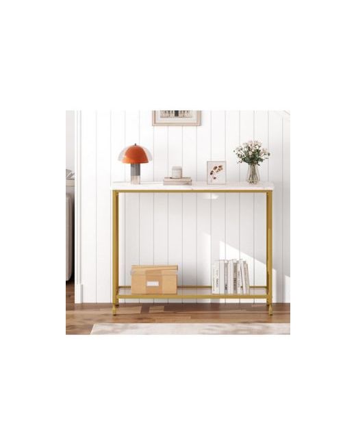This stylish console table combines a vintage wood grain finish with hazy glass, creating a modern and artistic atmosphere for your home. Designed to fit narrow spaces, it s perfect for entryways, hallways, foyers, or even behind a sofa. Measuring 33.5”L x 11.8”W x 31.9”H, this narrow table provides ample storage with two open shelves for books, plants, and decorations, while the gold metal frame ensures durability and stability. Crafted from high-grade engineered wood, thickened fluted glass, and heavy-duty metal, it can support up to 150 lbs. The adjustable footpads protect your floors and ensure stability on uneven surfaces. Additionally, the lower shelf offers extra storage for shoes or baskets, helping you keep essentials organized and within reach. Easy to assemble in just 30 minutes with labeled parts and clear instructions, this console table combines practicality with elegance to elevate your home or office decor.