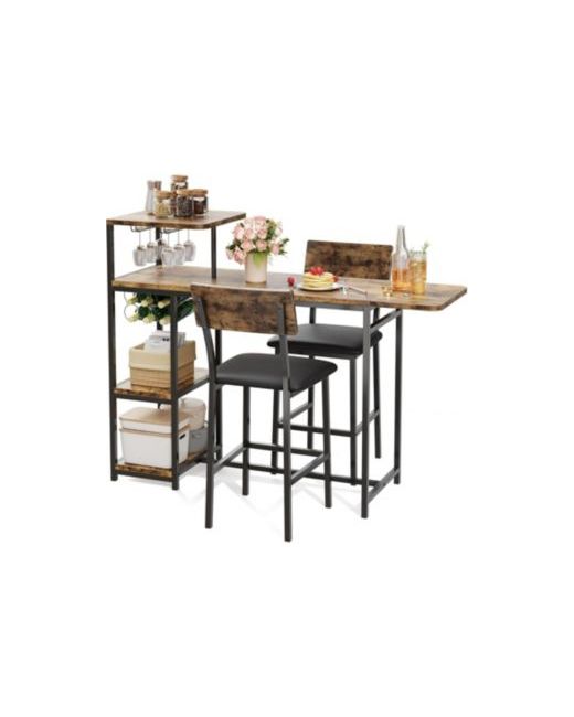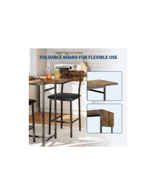 The dining table set for 2 is designed for compact spaces, making it perfect for small kitchens, living rooms, or even office nooks. It includes a sturdy Mdf table with a foldable top for flexible use, along with two bar stools featuring thick cushions for a comfortable seating experience. The set also includes three layers of shelves, offering efficient vertical storage without taking up extra space. Easy to assemble with clear instructions and all necessary tools, it's an ideal solution for those who need both a practical dining area and extra storage. Whether you're enjoying breakfast, hosting a small gathering, or working remotely, this set fits a variety of needs in any room of your home.