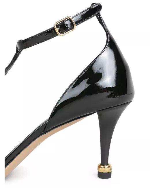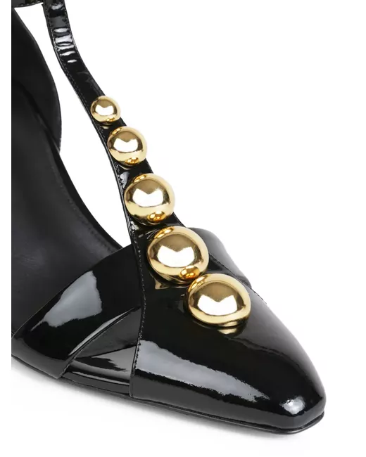 black patent finish round embellishments central strap buckle fastening tapered heel