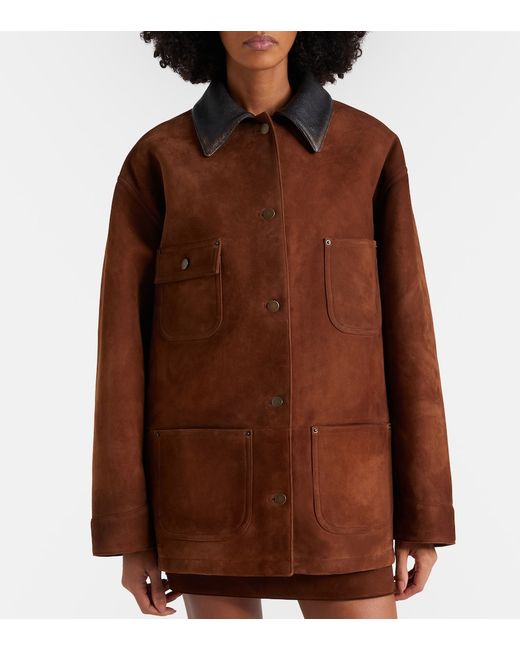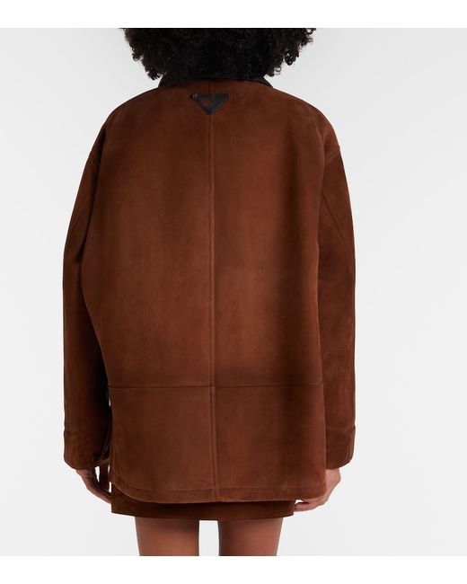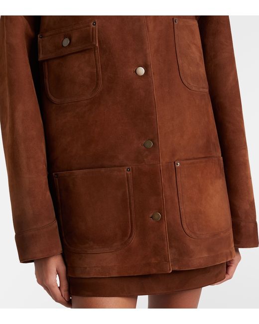 Material: 100% lamb leather (suede). Care instructions: specialist clean. Made in Italy. Designer color name: Brown. Lining: 61% polyamide, 30% polyurethane, 9% elastane. Trim: 100% goat leather. Closure: buttoned front. Pockets: flap chest pocket, patch pockets. Cuff: buttoned. Leather. Includes: garment bag.