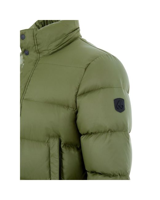 Moose Knuckles Green Padded Down Jacket. Medium-length, front zip fastening with covered buttons, two large side welt pockets with zip closures. Removable hood, light padding, logo applique on the sleeve. Composition: 74% Nylon, 26% Cotton Internal SKU: 25NOV68