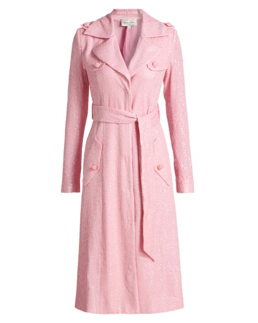 Crafted of sequined fabric, the Alpine coat from Cara Cara flaunts a traditional trench silhouette with notch lapels and a self-tie belt. Notch lapels Shoulder eppaulettes Long sleeves Side button-through flap pockets Self-tie belt 97% poly/3% spandex Dry clean Imported SIZE & FIT Model measurements: 5'10" tall Model is wearing US size Small. Contemporary Sportswear - Trend > Cara Cara > Saks Fifth Avenue. Cara Cara. Color: Regular Pink Sequin. Size: XS.