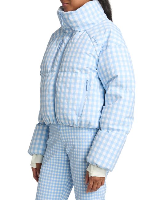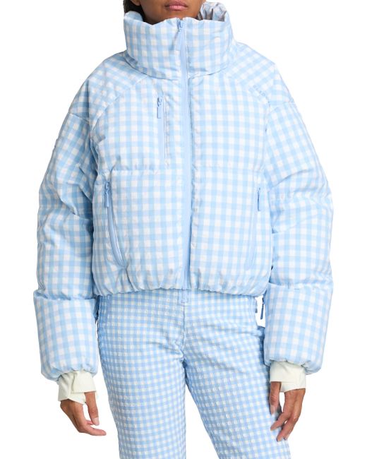 Cordova's Cortina ski jacket combines sleek style with premium warmth, featuring a cropped cut and overstuffed 700-power fill duck down for maximum insulation. Finished in a playful gingham print, this piece includes a front zipper, multiple pockets, and a high collar. Stand collar Long raglan sleeves, interior thumbholes Chest zip pocket Ski pass pocket Side zip pockets Interior pocket Front zip closure 52% polyester/48% polyamide Lining: 100% polyester Fill: 90% duck down/10% feathers Machine wash Imported SIZE & FIT About 23" from shoulder to hem Model measurements: 5'10" tall Model is wearing a US size Small. Outerwear And Swimwear - Down > Cordova > Saks Fifth Avenue. Cordova. Color: Cerulean Gingham. Size: XS.