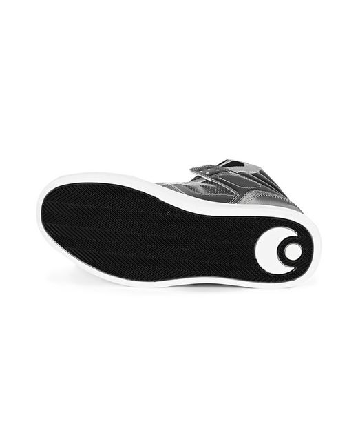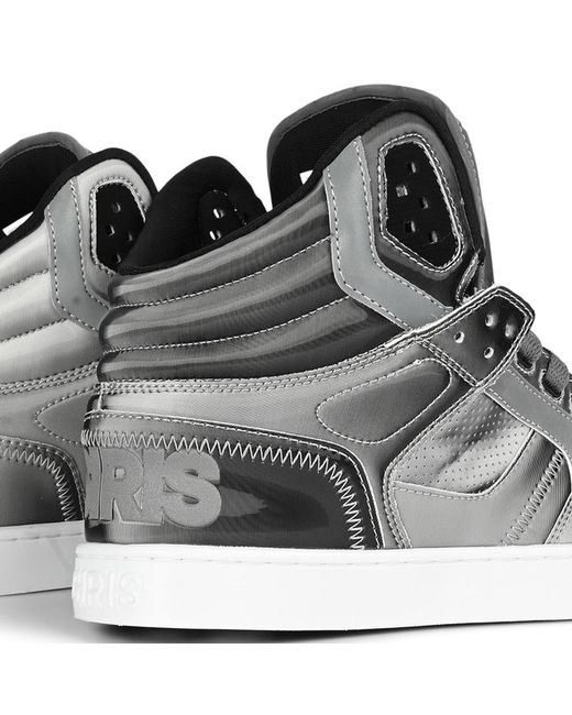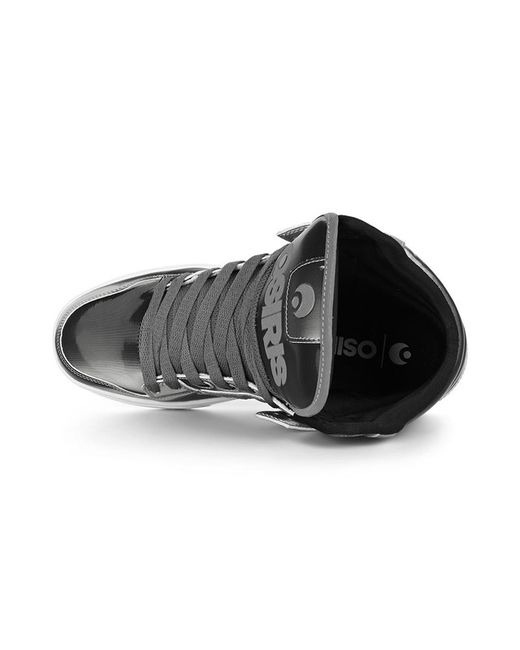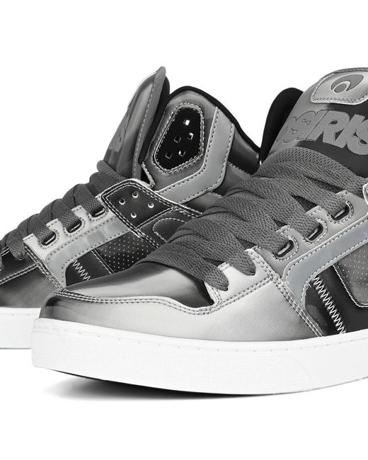 The Osiris Clone is a classically styled high-top skate shoe that features custom stitch detail and logo application. Silver synthetic upper with grey and black details atop a white and black sole unit.