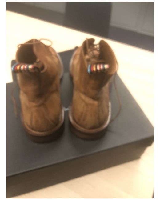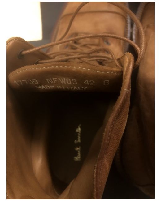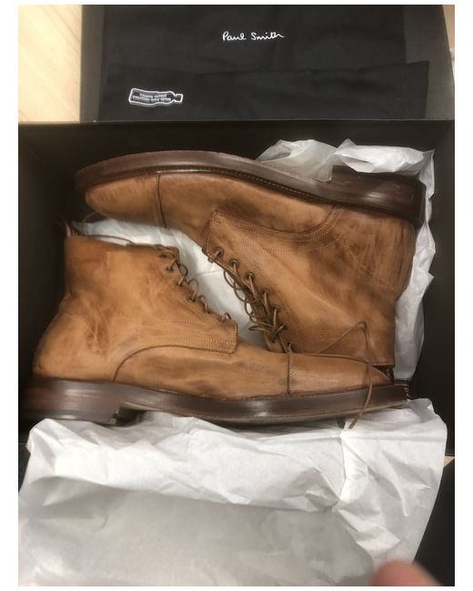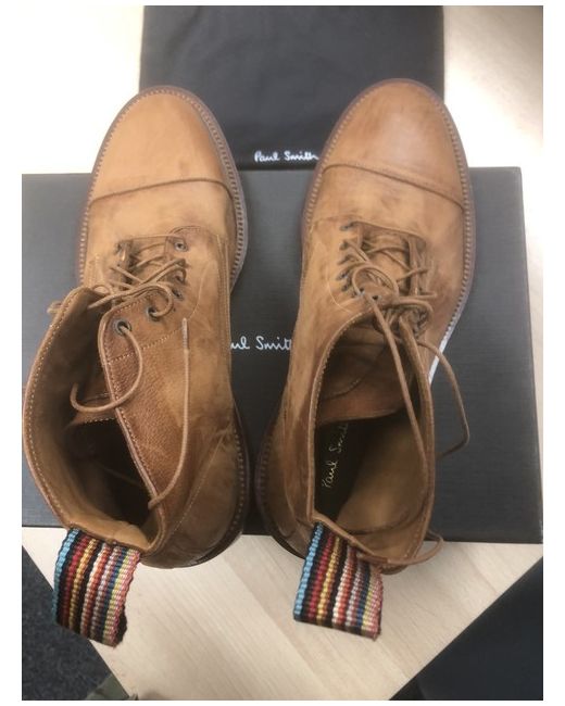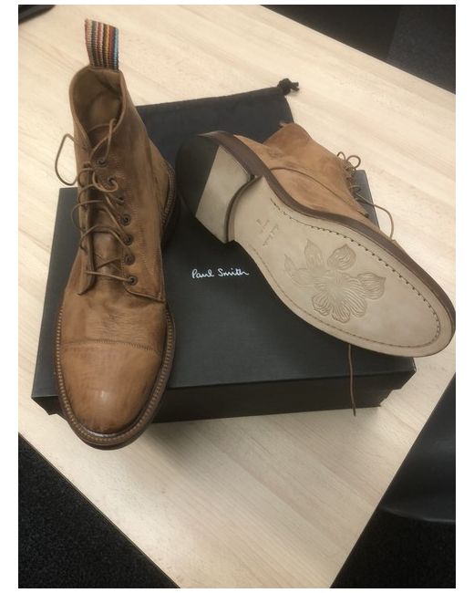 The Paul Smith men's boots in size 8 are a stylish and high-quality option for any man's wardrobe. With a round toe shape and lace-up closure, these tan leather boots from 2024 are both practical and fashionable. Featuring the signature Paul Smith brand, these Chelsea-style boots are made in Italy and lined with leather for ultimate comfort. Perfect for casual or smart-casual outfits, these boots are a versatile and timeless addition to any man's shoe collection.