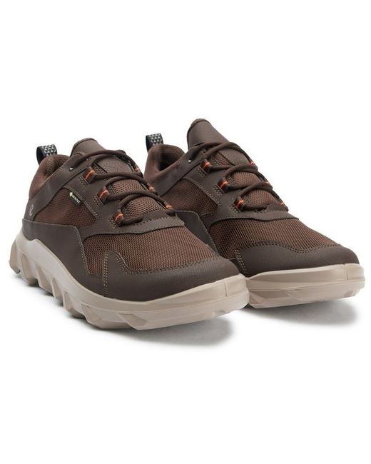 The Ecco Mx fuses motocross grit with everyday versatility in a brown trainer built for unpredictable terrain and weather. Gore-Tex keeps your feet dry while Fluidform technology delivers cushioned comfort mile after mile. Reflective collar and tongue details add visibility, and the rugged rubber outsole grips confidently whether you're hitting trails or navigating city streets in style.