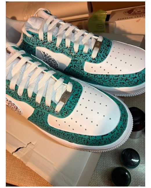 This product is a custom Air Force 1 trainer in size 9 UK (10 US), featuring a unique symbol design. The shoe is designed specifically for men and showcases an Aztec symbol-inspired theme with a turquoise colour palette. As a customised sneaker, it offers a personalised touch to the classic Air Force 1 style, making it a standout choice for those looking to make a statement with their footwear. The pricing is £200 as the pair took me a very long time to finish, but I am open to offers as long as they are respectable.
