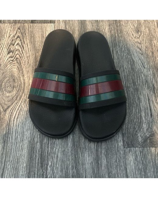 These Gucci sliders in red and green, size 9, are a stylish and casual footwear option for men. Featuring the iconic Gucci logo and slip-on closure, they are designed for the summer season with a rubber outsole for comfort and durability. The black colour and rubber upper material give them a sleek and contemporary look, perfect for adding a touch of luxury to any outfit.