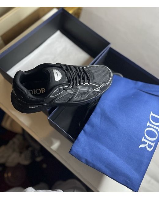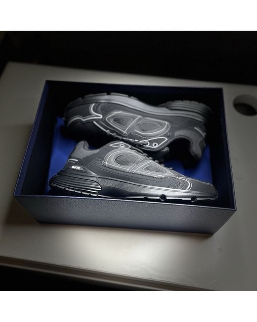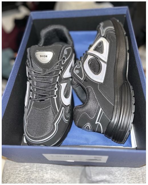 The Dior-B30 Black Shoes in size 10 (UK 9.5) are a stylish and sleek pair of low top trainers featuring a lace-up closure for a secure fit. With a subtle reflective detail and a comfortable foam insole, these shoes are perfect for casual occasions or even boxing activities. Made in Italy, these black sneakers from Dior are a versatile and fashionable addition to any man's wardrobe, embodying both luxury and practicality.