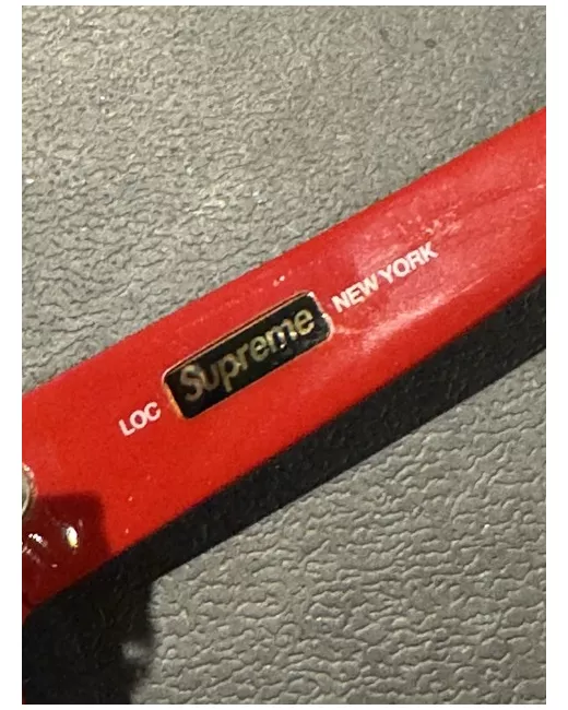 The product is a pair of authentic Supreme sunglasses in a square style, designed for unisex adults. The lenses are made of black glass, set in a red plastic frame. These sunglasses combo fashion and function, offering a sleek and stylish design with protection from the sun's rays. Perfect for adding a touch of urban cool to any outfit. Bought from Japan.
