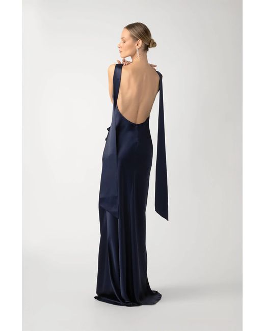 Open-back satin gown in bias-cut fit with shoulder straps and thigh-high slit, featuring enlogated statement wings that drape from each shoulder and decorative buttons that trail along the hip