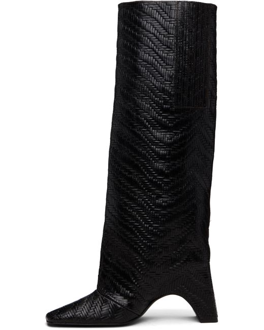 Knee-high woven leather slip-on boots. · Square toe · Logo printed at outer collar · Concealed elasticized gusset at inner side · Buffed leather lining · Block heel with rubber injection · Leather sole · Heel: H4 Supplier color: Brown