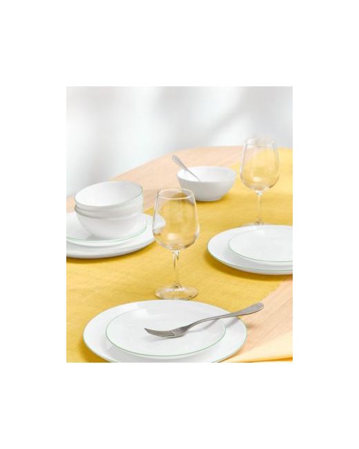 Serve meals with modern elegance using this opal glass dinnerware set from Arch Studio, featuring a mint rim. The set includes dinner plates, salad plates, and cereal bowls for a coordinated table setting.
