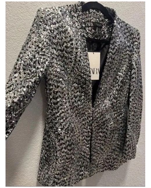 This Zara black silver sequinned blazer jacket in size S is a stylish and versatile piece for any woman's wardrobe. The polyester outer shell material gives it a sleek and modern look, while the sequin accents add a touch of glamour. The blazer style and regular fit make it a timeless and classic choice that can be dressed up or down for various occasions, making it a must-have for any fashion-forward individual.