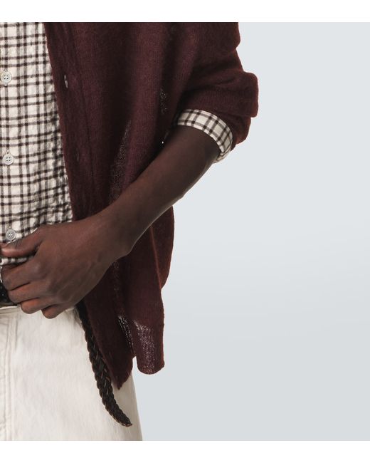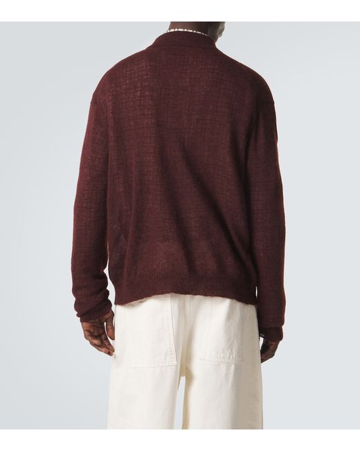 Material: 37% mohair, 37% alpaca wool, 26% polyamide. Care instructions: hand wash. Made in China. Designer color name: Mulberry. Collar: polo collar. Closure: buttoned front. Hem: straight, ribbed. Cuff: ribbed.