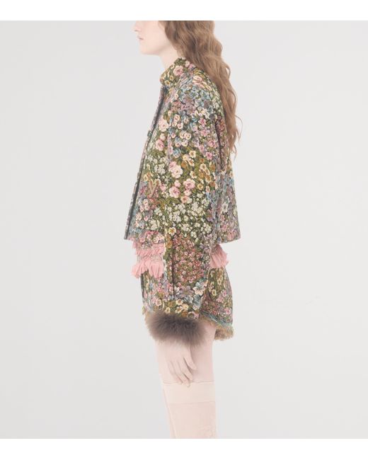Valentino reimagines the classic pea coat as a tapestry of romance and theatrical flourish. Florals bloom across the exterior, creating a richly textured surface that feels almost painterly, while plush faux fur cuffs introduce a touch of soft drama. Finished with gold V hardware at the pockets, it becomes a statement of House codes made modern, blending heritage detailing with a boldly expressive spirit.