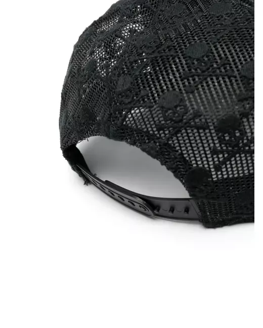 black cotton skull embroidery to the front mesh panelling flat peak rear touch-strap fastening