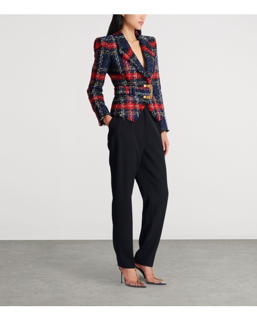 From its founding in 1945 to the current day, Balmain has continually been driven by impeccable tailoring, a vision expressed to vibrant effect in this jacket. Cut from red and blue tweed, its amplified shoulders are matched by the oversized belt buckle, which cinches in the waist for a classic Balmain silhouette.