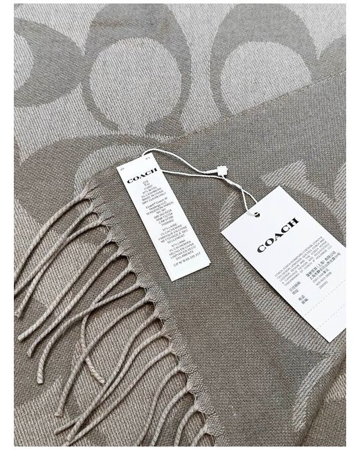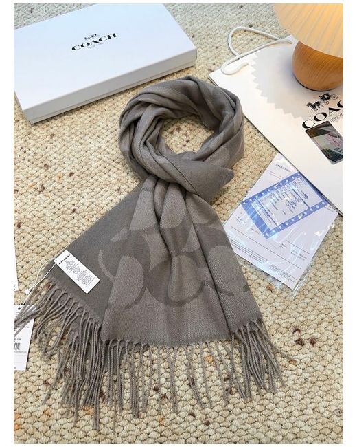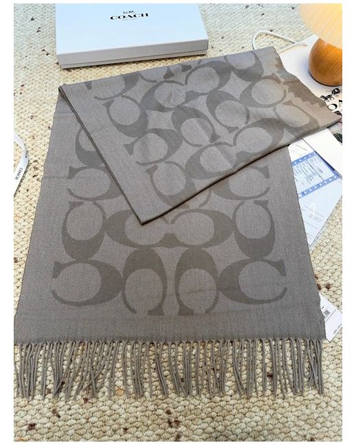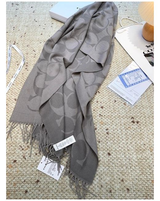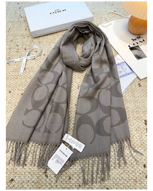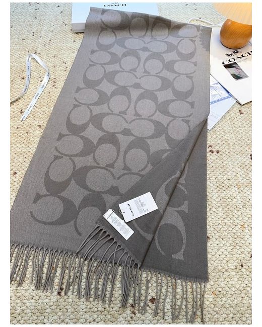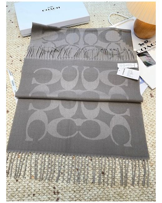 The Coach gray double-C patterned wool scarf is a stylish and luxurious accessory for women. Made from high-quality wool in a sophisticated grey colour, this scarf features the iconic Coach logo design, adding a touch of elegance to any outfit. Perfect for staying warm in style, this versatile scarf can be worn in a variety of ways to complement different ensembles. Ideal for both casual and formal occasions, this Coach scarf is a must-have for any fashion-forward woman's wardrobe.