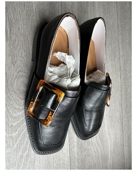 New unworn black leather loafers. Square toe, tortoise shell large buckle design. Size 5.