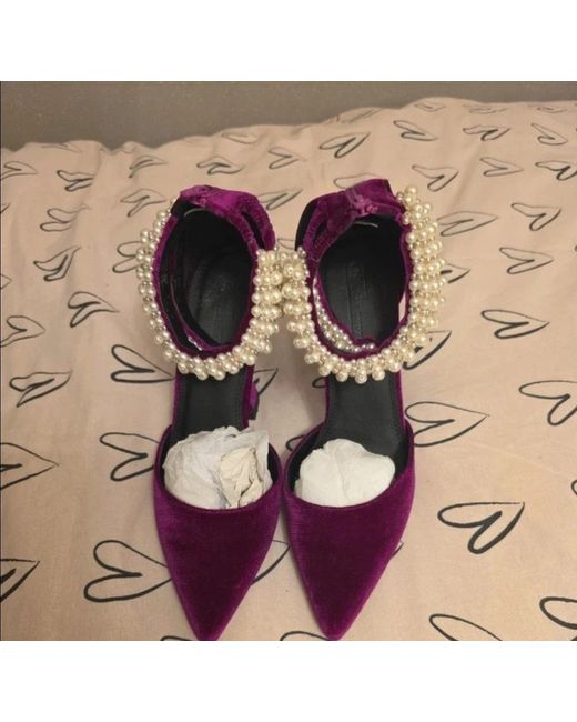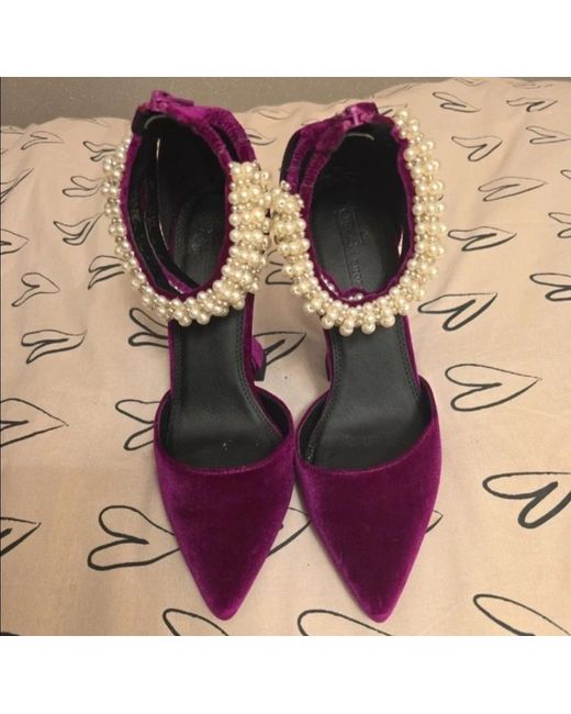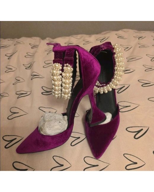 stunning Purple Velvet Pearl heels ✨️🩷 these will fit a size 6 and 7 foot. love these but they are a little too big for me, so unfortunately, they are just sitting there not going to be used and sitting looking pretty! paid alot for these beauties. Beautiful pearls around the ankle area. Zip up back. welcome to message and discuss price also. ✨️💜✨️