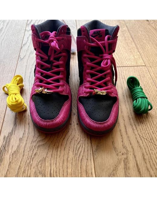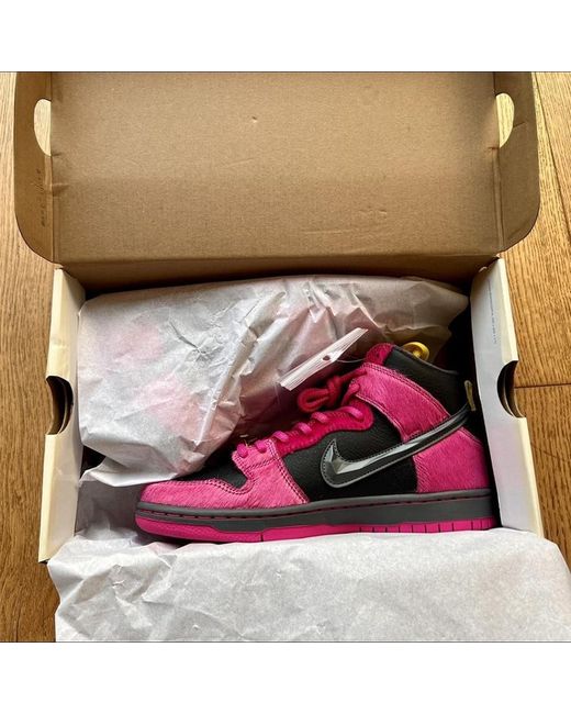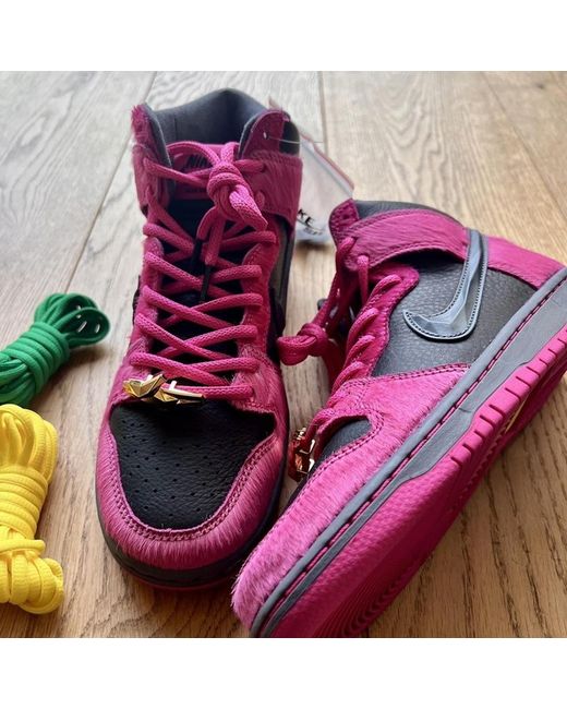 Nike SB X RTJ UK6 EU39 Made in collaboration with American Hip Hop duo Run The Jewels, the Nike SB Dunk High x Run The Jewels Pink Black pays homage to the pair's fourth album. Its leather base is decorated with pink pony hair overlays and 3D jewel-textured Swooshes. Cushioning underfoot offers comfort, the secure lacing system is finished with a custom lace dubrae and a stash pocket on the tongue adds extra functionality to the shoe. Add the Nike SB Dunk High x Run The Jewels Pink Black to your collection now.