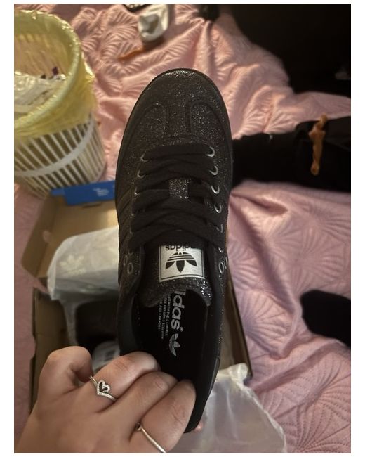 The glittery adidas Samba trainers are a stylish and modern choice for women. With a low top design and lace-up closure, these black sneakers feature the iconic adidas logo as accents. Made with a blended fabric and rubber outsole, they are perfect for casual occasions and even gym & training activities in the summer season. The standard shoe width and foam insole provide comfort and support, making them a versatile and fashionable option for everyday wear. open to offers