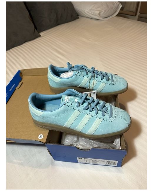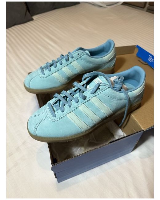 The Adidas Bermuda Size 4 is a stylish women's trainer in a low top style with a lace-up closure. It features a comfortable rubber outsole and standard shoe width, perfect for casual occasions in the spring season. The blue suede upper is adorned with the Adidas logo, showcasing the brand's signature aesthetic. This sneaker offers both style and comfort, making it a versatile choice for everyday wear.