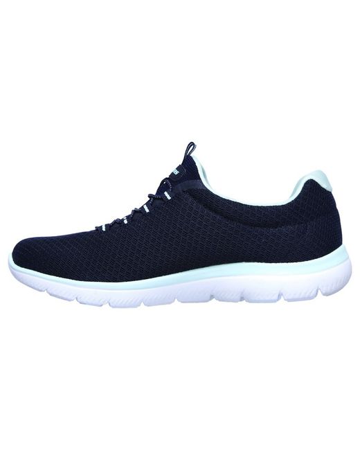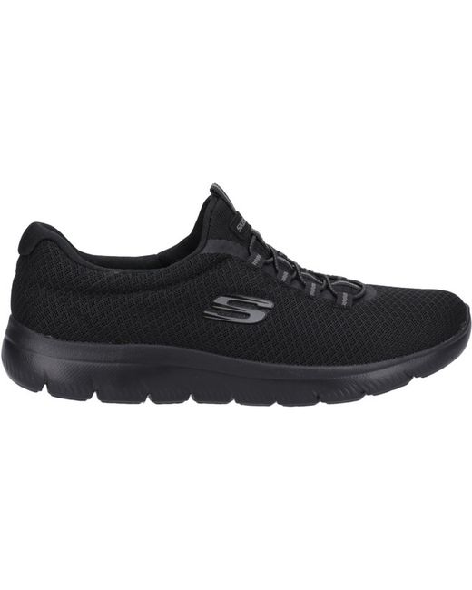 Reach the heights of sporty style and comfort with the Summits shoe. Nearly one piece soft smooth flat knit mesh fabric upper in a bungee laced slip on athletic training sneaker with stitching accents.