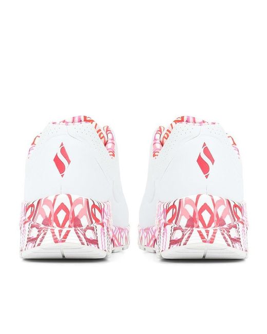 Walk with Love wherever you go in the Skechers x JGoldcrown Street Uno Love trainers. This lace-up fashion trainers features renowned muralist James Goldcrown's signature heart print while the Air Cooled Memory Foam insole and platform wedge heel with Skech-Air air-cushioned insole gives you all the classic comfort that you would expect from Skechers.