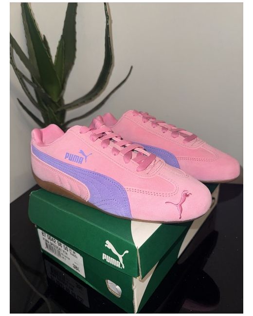 This product is a pair of Puma Speedcat trainers in a pink and lavender colour scheme, size 5 UK. The shoes feature a low top shaft style with a lace-up closure, suitable for casual occasions. The rubber cleat type offers overpronation support, while the foam insole ensures comfort. The standard shoe width and suede upper material make them a stylish choice for women who love the cat theme. Perfect for spring, these sneakers combine functionality with a trendy design from a trusted brand like Puma.