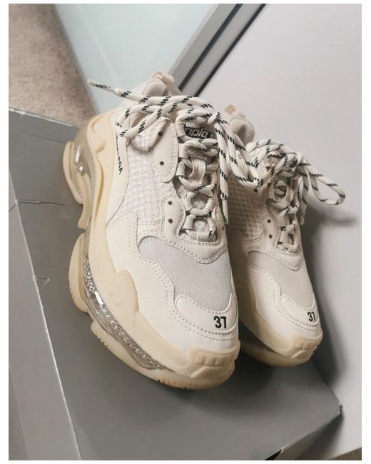 The Balenciaga Triple S Women's Trainers in size 4 are a stylish and comfortable choice for casual occasions. These trainers feature a low top design with a lace-up closure and a standard shoe width. The beige colour and signature Balenciaga logo accents add a touch of designer flair to these sneakers. With a rubber outsole and comfortable features, these trainers are perfect for spring and can be worn for racing activities. The Balenciaga Triple S model is a popular choice among women looking for a blend of fashion and functionality. Paid £825 !! Worn once !!