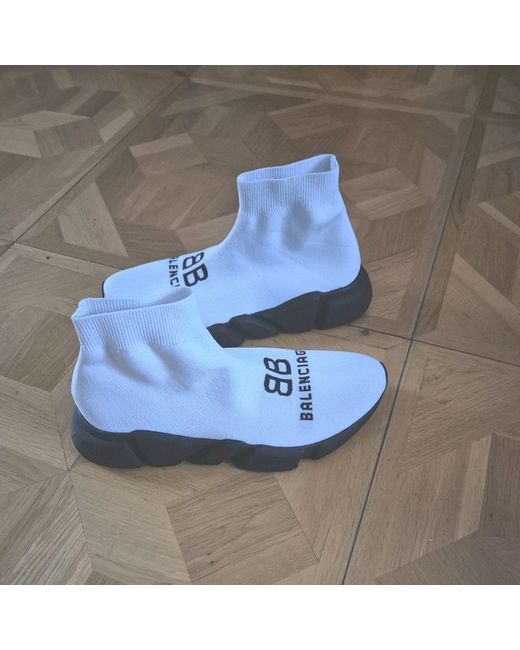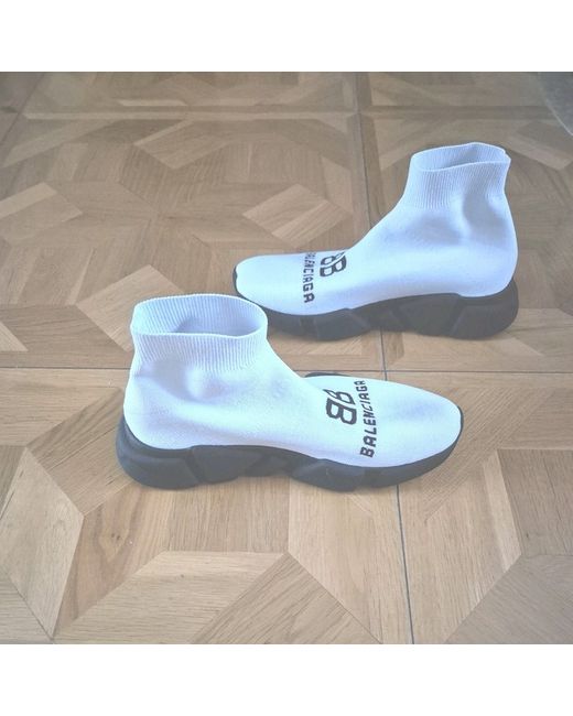 Ladies white Balenciaga Speed Sock Trainers. SIZE 6. Brand New and only been tried on never worn. Box been under the bed for ages so it is better these shoes go to a new owner. Made from recyclable materials. Sorry comes with out dustbag as my daughter didn't want the shoes but decided to take and use dust bag. This style of Balenciaga shoes are very comfortable. Genuine item.