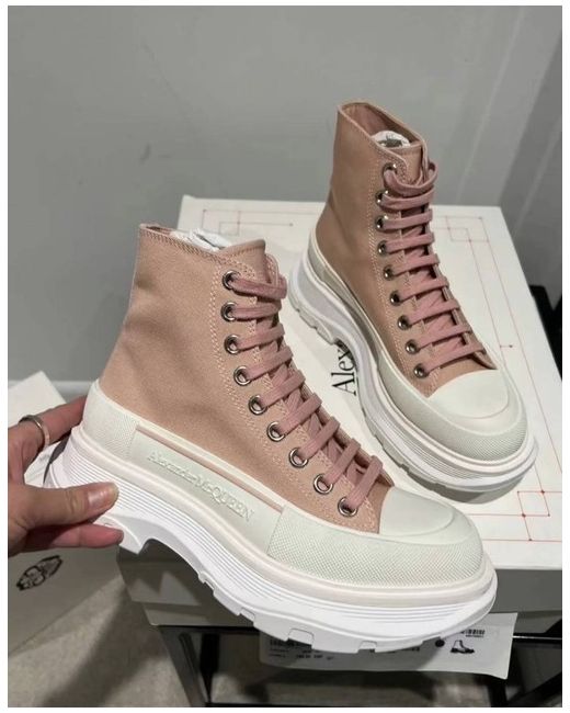 Hello, Pink cotton lace up boots with a lightweight oversized rubber tread sole, finished with a textured rubber wrap, a tonal Alexander McQueen signature and a signature ribbon at the back. The round toe silhouette and rubber toe cap give them a distinctive and refined look. I purchased this pair recently but they are a little too big for me. I am happy to drop them off in Central London or near Canary Wharf. Thanks!