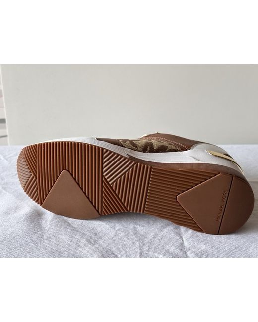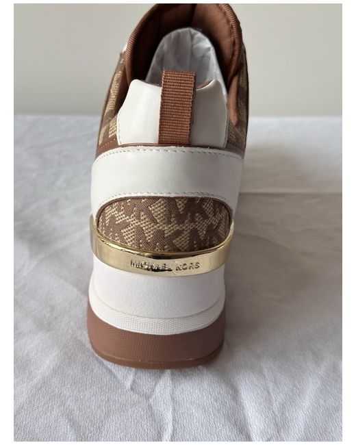 The Michael Kors Women's Trainers in UK size 6, equivalent to US size 8.5, are stylish lace-up sneakers perfect for casual occasions. Made from leather with a rubber outsole, these beige trainers feature the iconic Michael Kors logo accents. Designed for supination and offering comfort, these designer trainers are ideal for walking and the summer season. Perfect for adding a touch of luxury to your everyday look, these standard-width trainers combine fashion and functionality effortlessly.