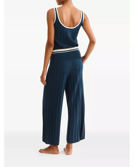 dark blue ribbed knit elasticated waistband two back patch pockets two side inset pockets straight leg
