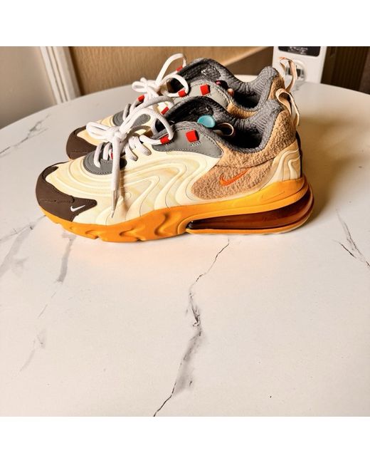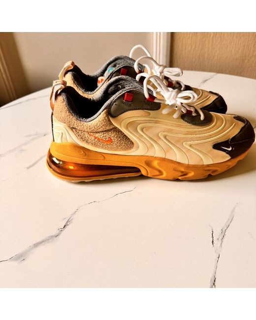 The Nike Air Max 270 React Cactus Trails sneakers are a collaboration with Travis Scott, featuring a low top design with a lace-up closure for a secure fit. With a brown colour and rubber outsole material, these trainers are perfect for casual occasions and everyday wear. The standard shoe width ensures a comfortable fit, making them a stylish and practical choice for men looking to add a touch of creativity to their footwear collection.