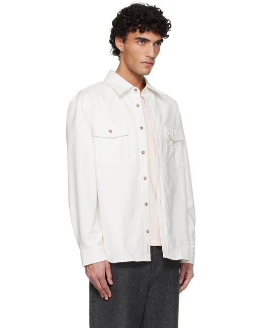 Organic cotton flannel overshirt. · Spread collar · Button closure · Flap pockets at chest · Shirttail hem · Dropped shoulders · Buttoned barrel cuffs · Twin pleats at back yoke Supplier color: White