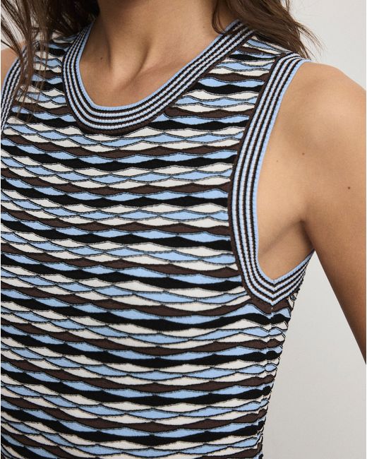 A fresh take on our favorite tank. Crafted from a premium stretch knit, the Jerrel sleeveless top features a blue ripple diamond jacquard pattern for a modern take on prep. Designed with a cropped silhouette and crew neckline, it's finished with a striped trim and extra-wide hem for added dimension. Wear it solo or as a versatile layering piece.83% Viscose, 17% PolyesterDry clean onlyStyle #2602KS1290605