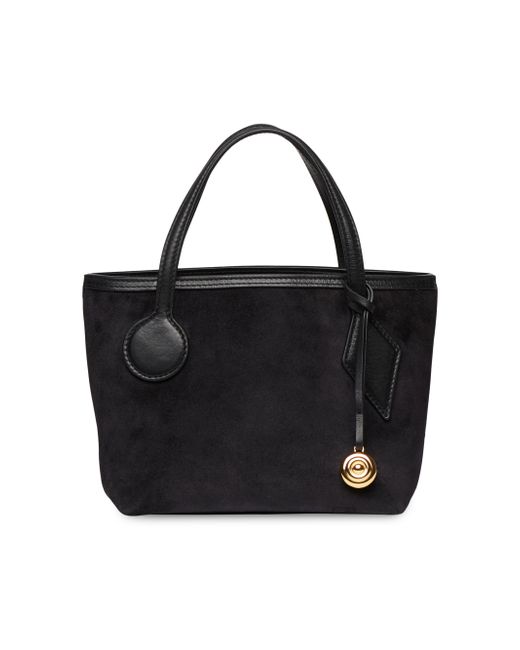 Crafted of suede, Liffner's Sprout Micro tote bag features a goldtone charm, spacious interior, and a removable shoulder strap for versatile styling. Made with responsibly tanned suede Two top handles Removable shoulder strap Interior: removable zip pocket Dust bag Snap closure Responsibly tanned suede Lining: cotton Made in Italy SIZE About 7.5"W x 6.5"H x 5"D Top handles: about 4" drop Removable shoulder strap: about 21" drop. Handbags - Collection Handbags > Liffner > Saks Fifth Avenue. Liffner. Color: Suede Black Gold Charm. Size: 10.