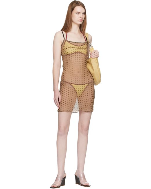 Sheer viscose chiffon midi dress. · Polka-dot pattern printed throughout · Picot trim at scoop neck · Scalloped detailing at elasticized spaghetti straps Supplier color: Tan