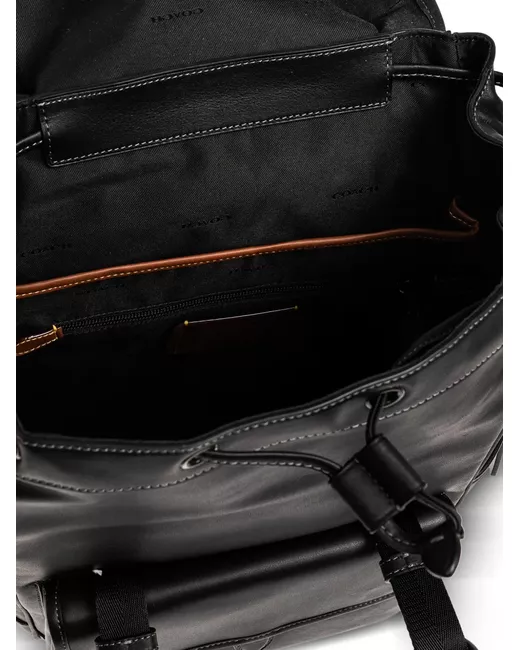 black calf leather top handle exterior flap pocket adjustable shoulder straps drawstring closure foldover top buckle fastening