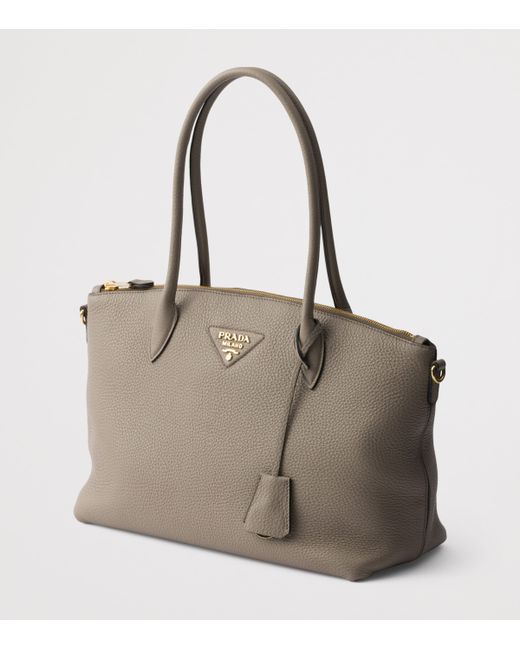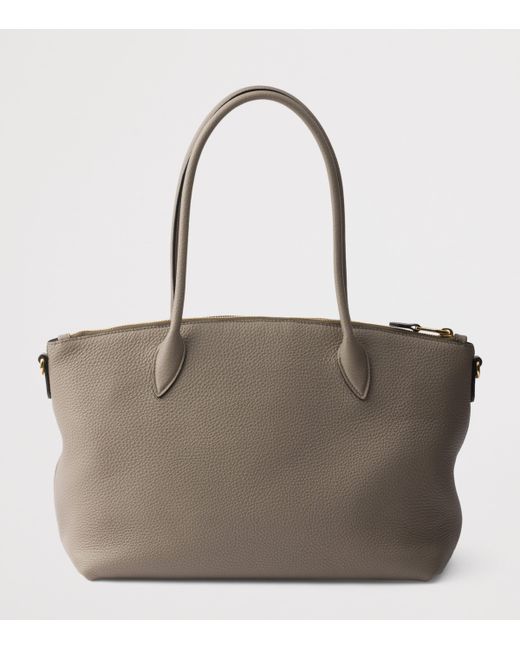 Pragmatic elegance defines this leather tote bag, crafted with a sleek silhouette and softly grained leather for a refined yet relaxed finish. Paying homage to Prada's heritage in leather goods, the design echoes the original travel bag, a testament to the Italian atelier's enduring commitment to craftsmanship.