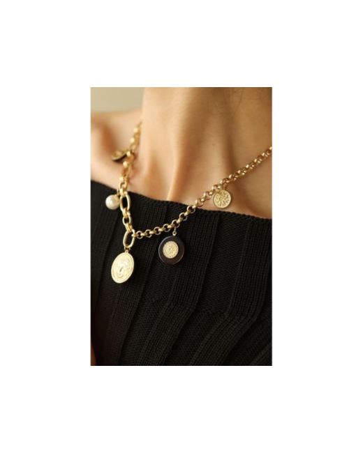 Pendant necklace inspired by solar emblems with resin and pearl elements for a mythic statement look.