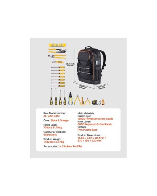 Tackle any job with this heavy-duty tool backpack, designed for electricians, repair pros, and Hvac techs who need serious storage and comfort on the go. Built from rugged 1680D/600D Oxford fabric with a molded Pvc base, it resists tears, splashes, and tipping while supporting up to 70 lbs of tools. Inside, 65 pockets and a removable divider keep drills, wrenches, testers, and small parts neatly organized, while a dedicated laptop compartment and clear pouch protect your tech and essentials. Wide padded shoulder straps, an adjustable chest buckle, and a breathable back panel reduce strain during long days, and reflective strips boost visibility in low light. The included 21-piece tool set-featuring screwdrivers, socket drivers, pliers, cutters, testers, and more-means you re ready to work right out of the box.