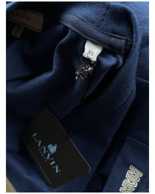 LANVIN Oversized Tee in Indigo Cotton Knit, with Long Cotton Shirt Sleeves with Contrasting Stripes, Small Contrasting Collar with Button Fastening, and Chest Pocket with Reinterpreted "Lnvn" Logo.