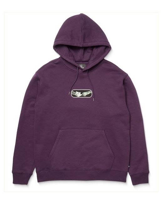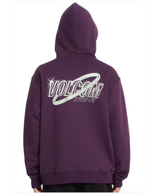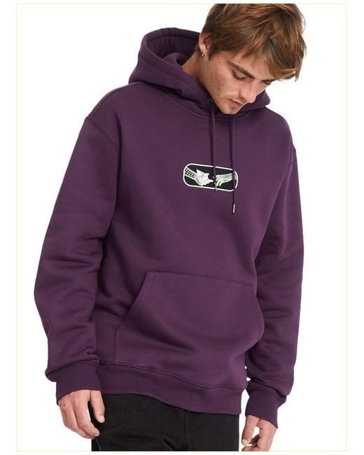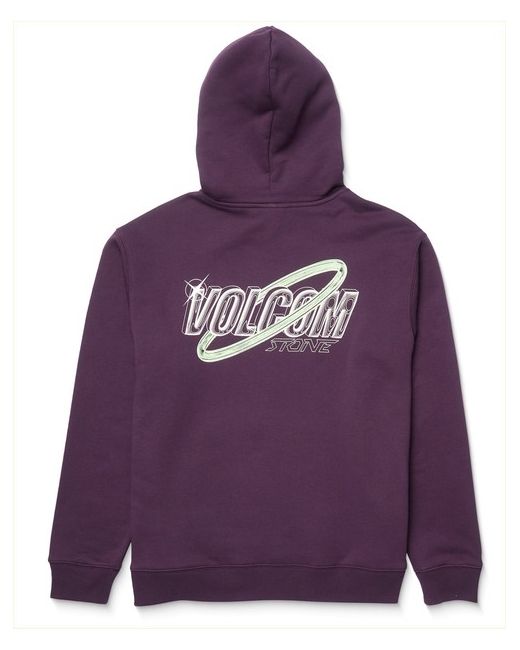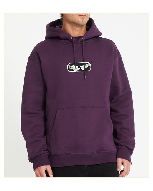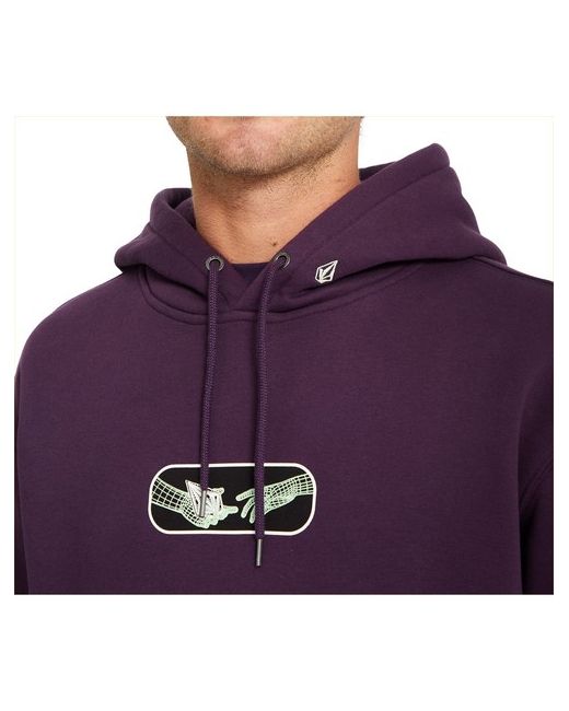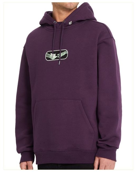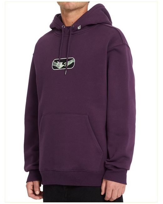 Volcom Noder regular fit pullover fleece in grape royale features a adjustable drawstring hood and chest print as well as kangaroo pouch and rear print. Made from cotton and recycled polyester. Volcom chest graphic print.