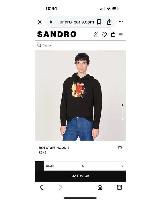 The Sandro Hot Stuff Hoodie in size Medium is a stylish pullover designed for men. Featuring a hood and made in a sleek black colour, this hoodie offers both comfort and a modern look. Made by the renowned brand Sandro, known for their high-quality and fashionable clothing, this hoodie is a must-have for any man's wardrobe. Perfect for casual wear, this hoodie can be easily paired with jeans or shorts for a casual yet trendy outfit.