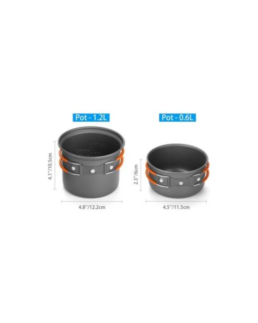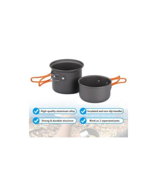 This 6-piece camping cookware set is the ultimate all-in-one outdoor cooking solution, including 2 non-stick pots, a foldable stove, a spork, a cleaning cloth, and a carry bag. Crafted from durable, anodized aluminum, the pots are lightweight yet sturdy, conducting heat efficiently for quick meal preparation. The foldable handles and compact design save space, while all items—including a gas tank—fit neatly into the included mesh bag for easy transport. Perfect for camping, hiking, backpacking, and picnics, this portable cookware kit allows you to enjoy convenient, efficient cooking anywhere. A must-have for outdoor enthusiasts and a great value for the quality and functionality it offers.