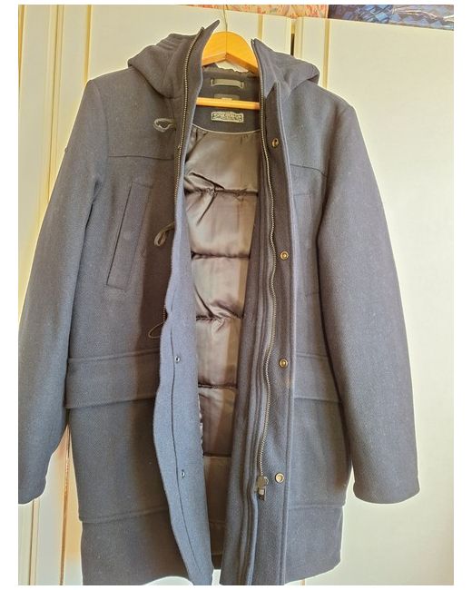 Smart black duffle coat. 2 chest pockets with stud closure. 2 large flap pockets and 2 side pockets. Very warm with padding interior. Main zip closure with studs and togs. Wool blend.